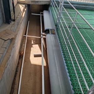 过去清粪,咱得弯腰弓背扒粪堆,夏天臭得熏人,冬天冻得手僵。但这羊场的塑料漏缝板底下,藏着蓝色的输送带,羊粪一落地就被接住,顺着带子往后走。你再看羊床跨度 3 米,底下用白色玻璃钢横梁撑着,漏缝板扣得稳...